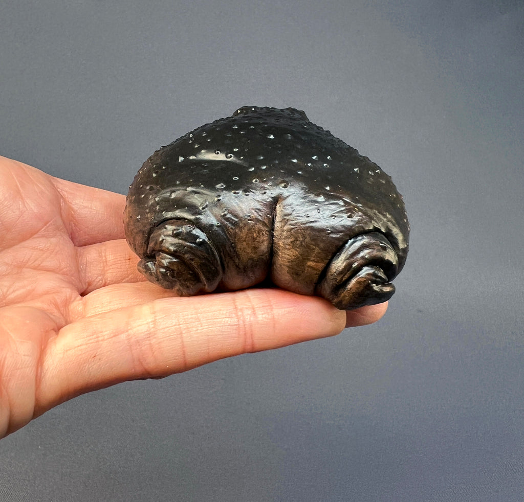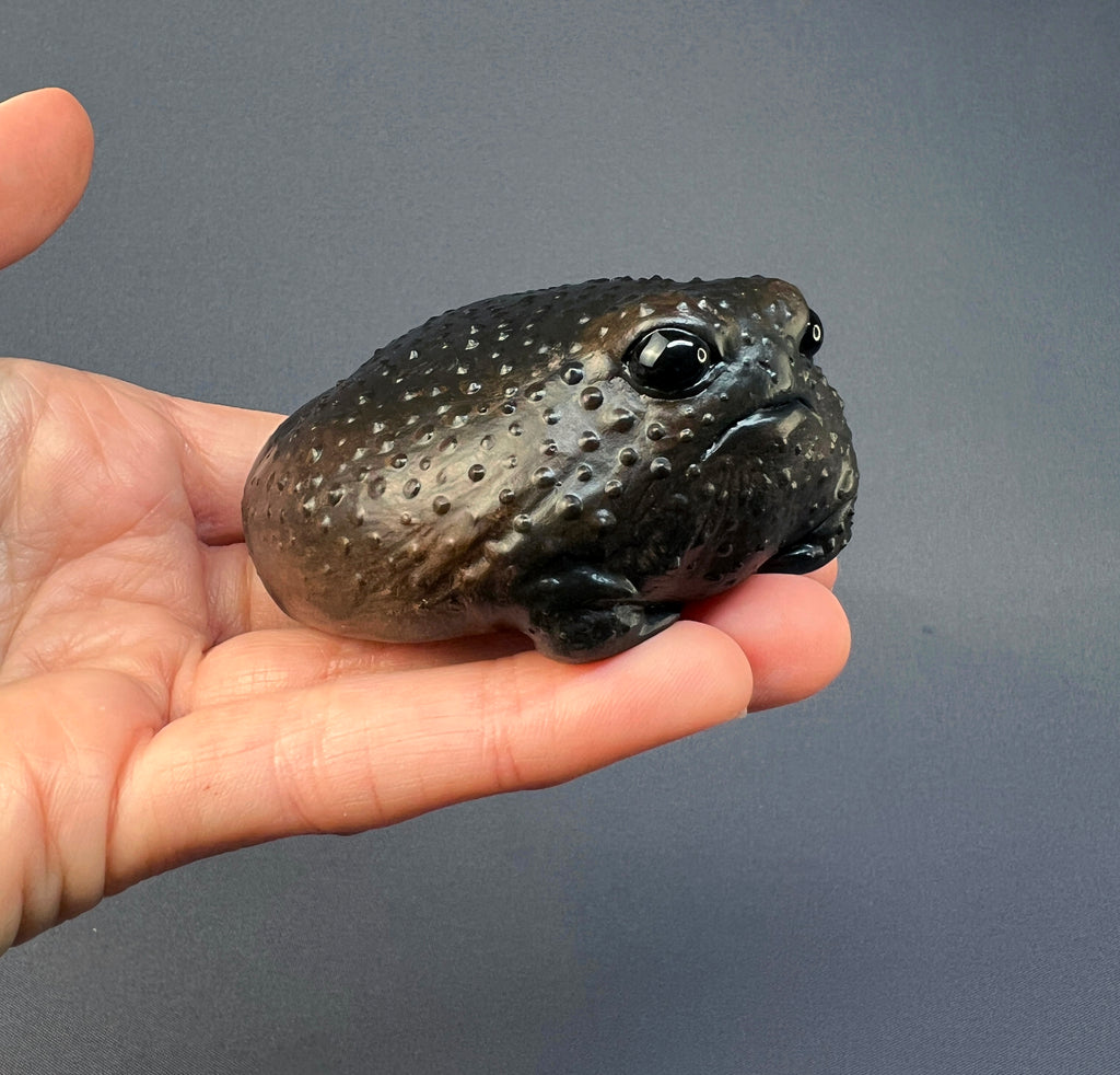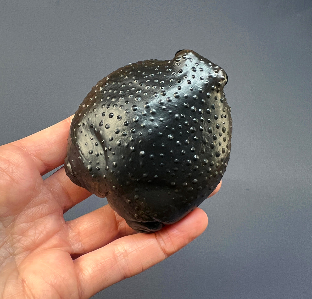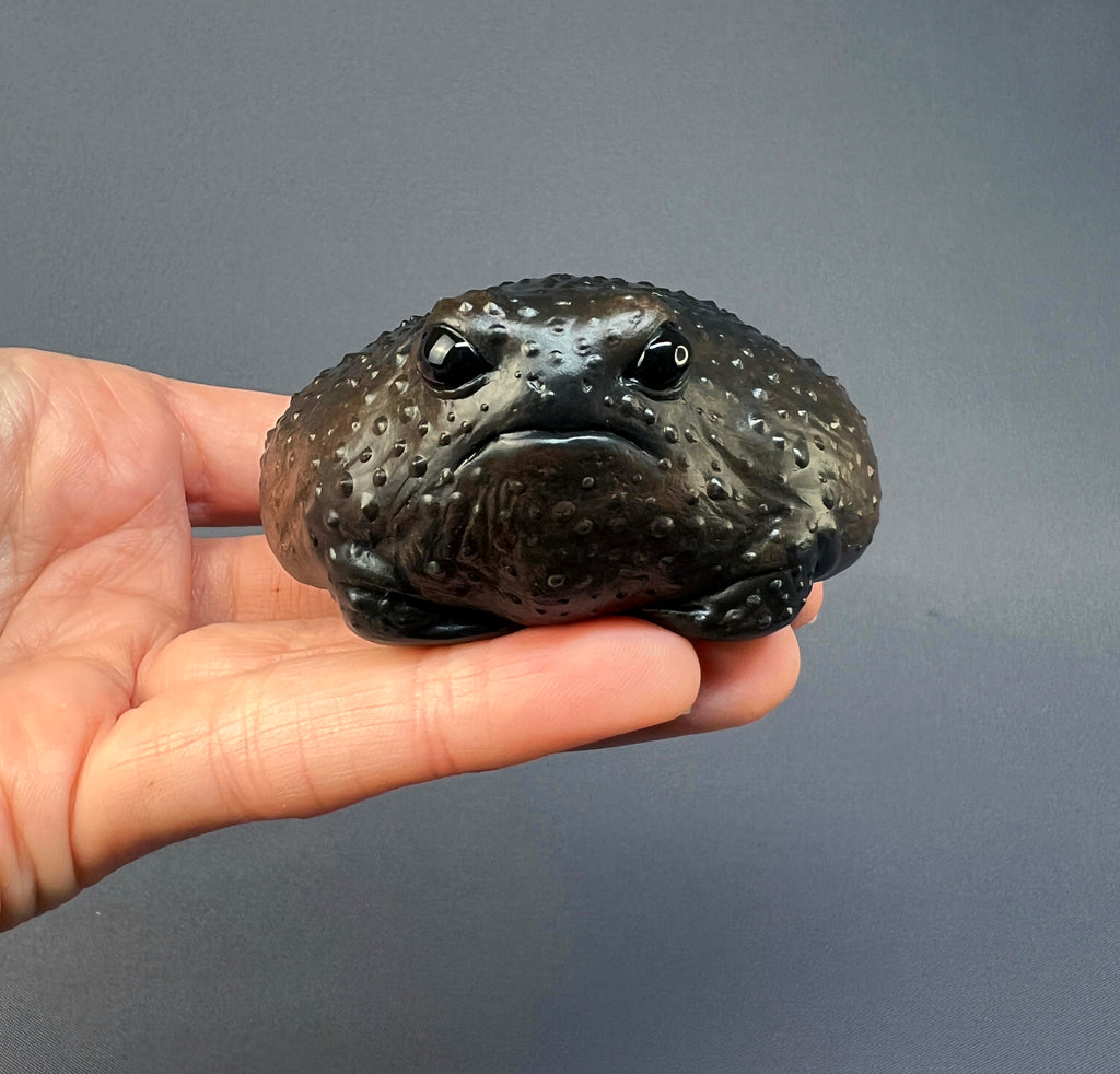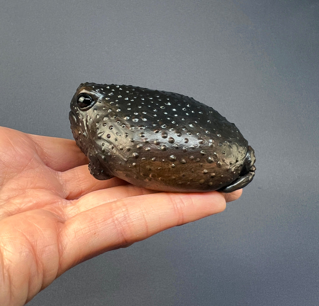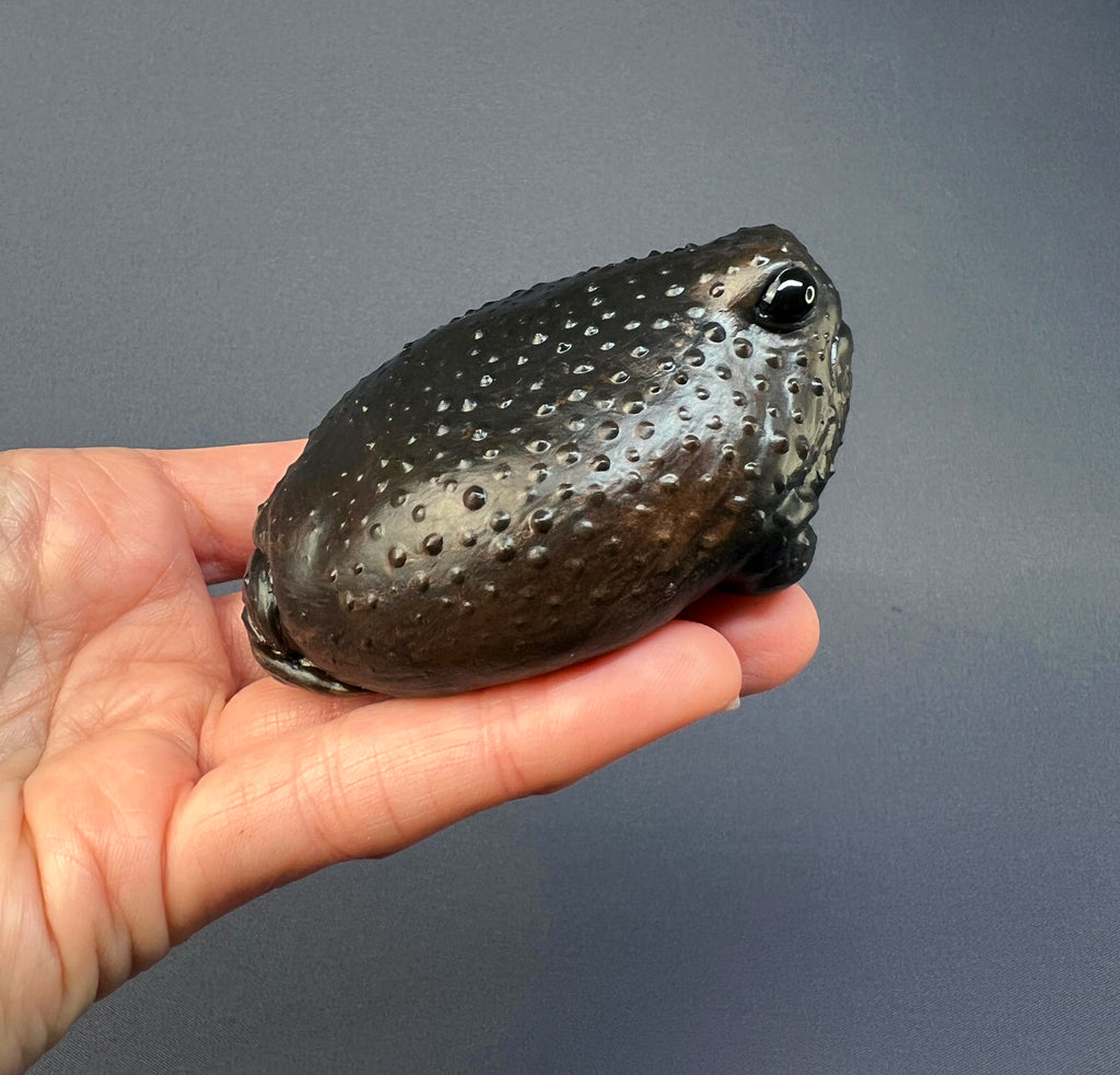 This frog was inspired by the Black rain frog (Breviceps fuscus). It’s cast in hard white gypsum, textured and carefully hand-painted. There’s quite some weight to this plump, similar to stone, so it would make a great grumpy paperweight! It measures roughly 3” (8cm) in diameter.