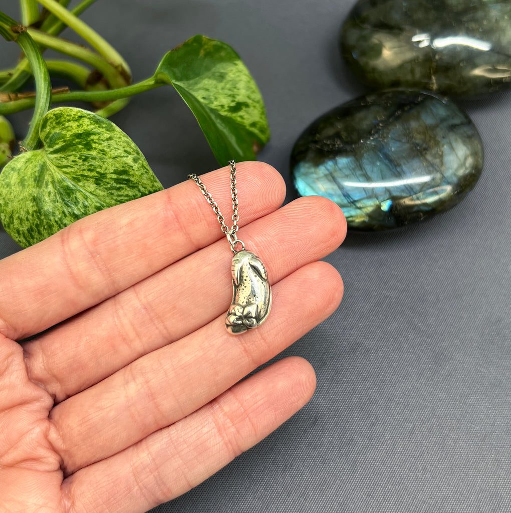 The nudi measures 20x9.5mm (0.8x0.4") and comes in a sleek black box with satin ribbon. The necklace includes 42cm (16.5") sterling silver chain, oxidized for contrast.