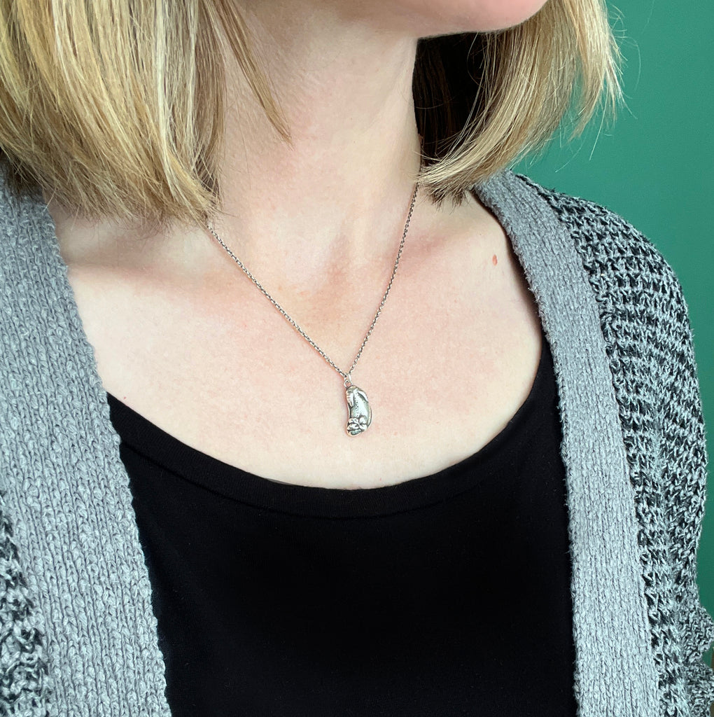 This piece was carefully hand-sculpted with precious metal clay, torch-fired, oxidized and polished to a mirror finish. The pendant is 99.9% fine silver, with a silver-soldered sterling silver jump ring.