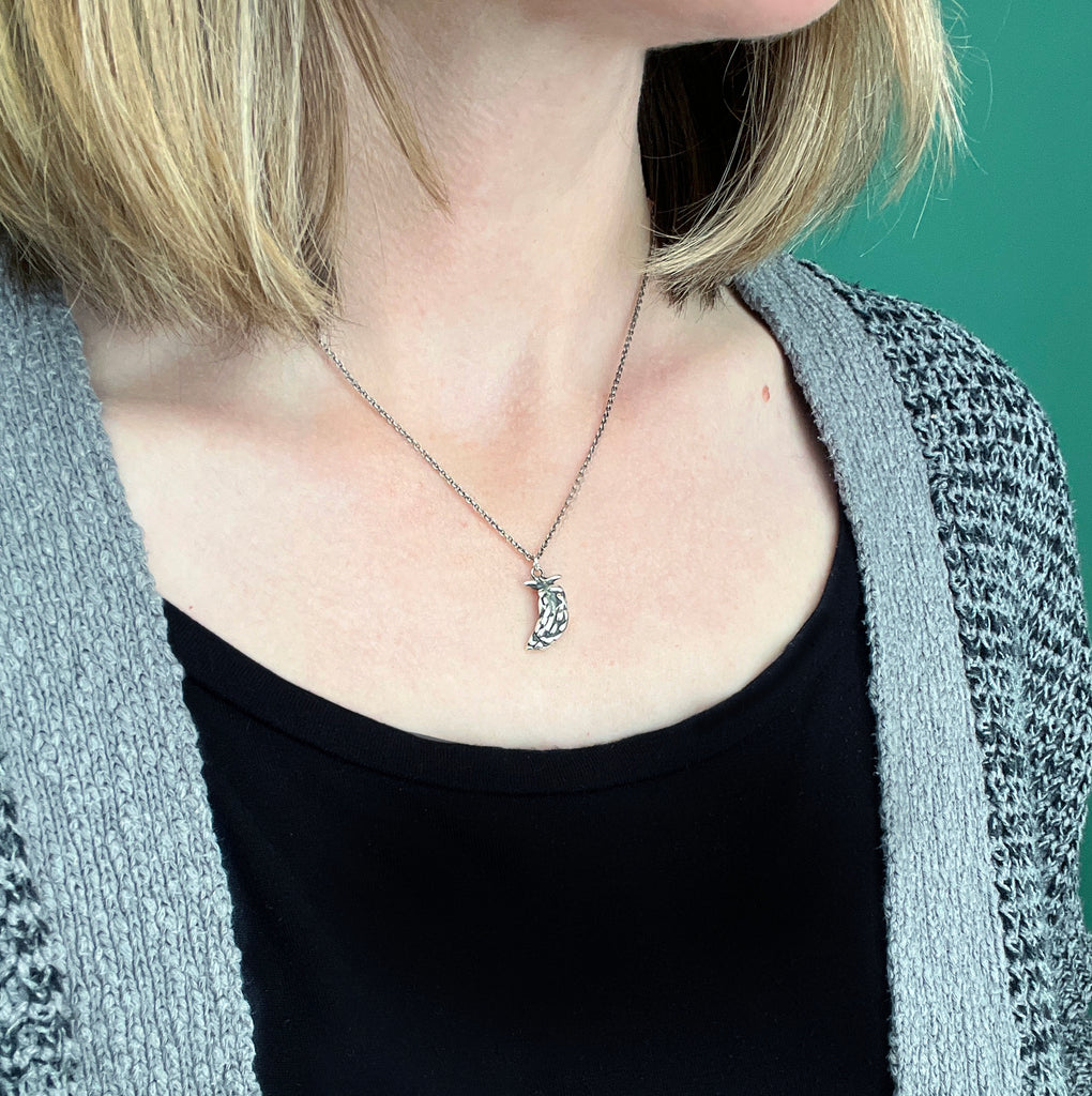 The pendant was carefully hand-sculpted with precious metal clay, torch-fired, oxidized and polished to a mirror finish. The piece is 99.9% fine silver, with a silver-soldered sterling silver jump ring.