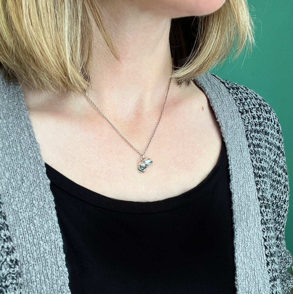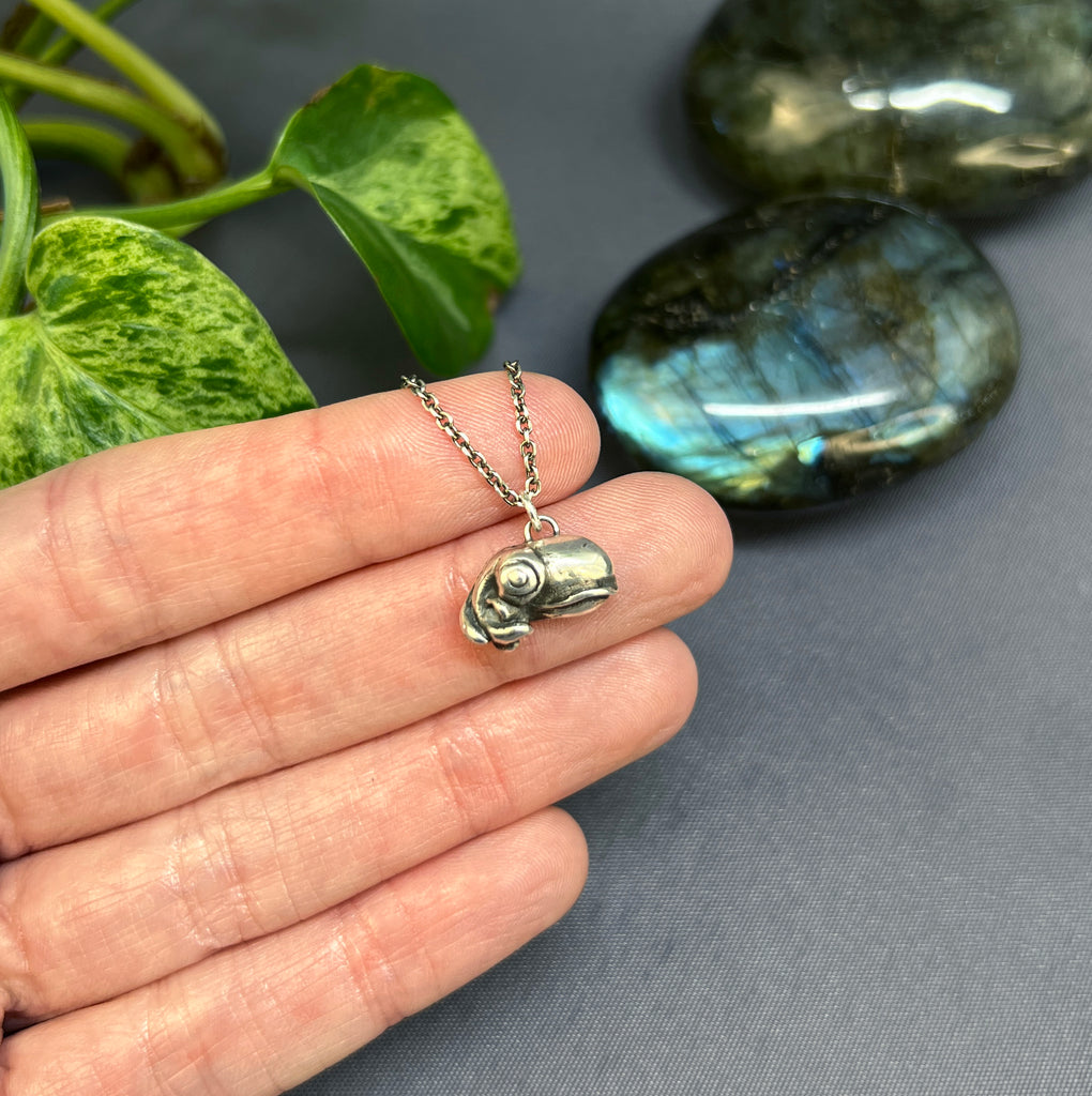 This adorable pendant was inspired by the bobtail squid (order Sepiolida), a group of cephalopods closely related to cuttlefish. The piece was carefully hand-sculpted with precious metal clay, torch-fired, oxidized and polished to a mirror finish. It's 99.9% fine silver, with a silver-soldered sterling silver jump ring.