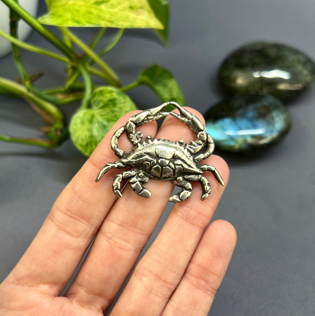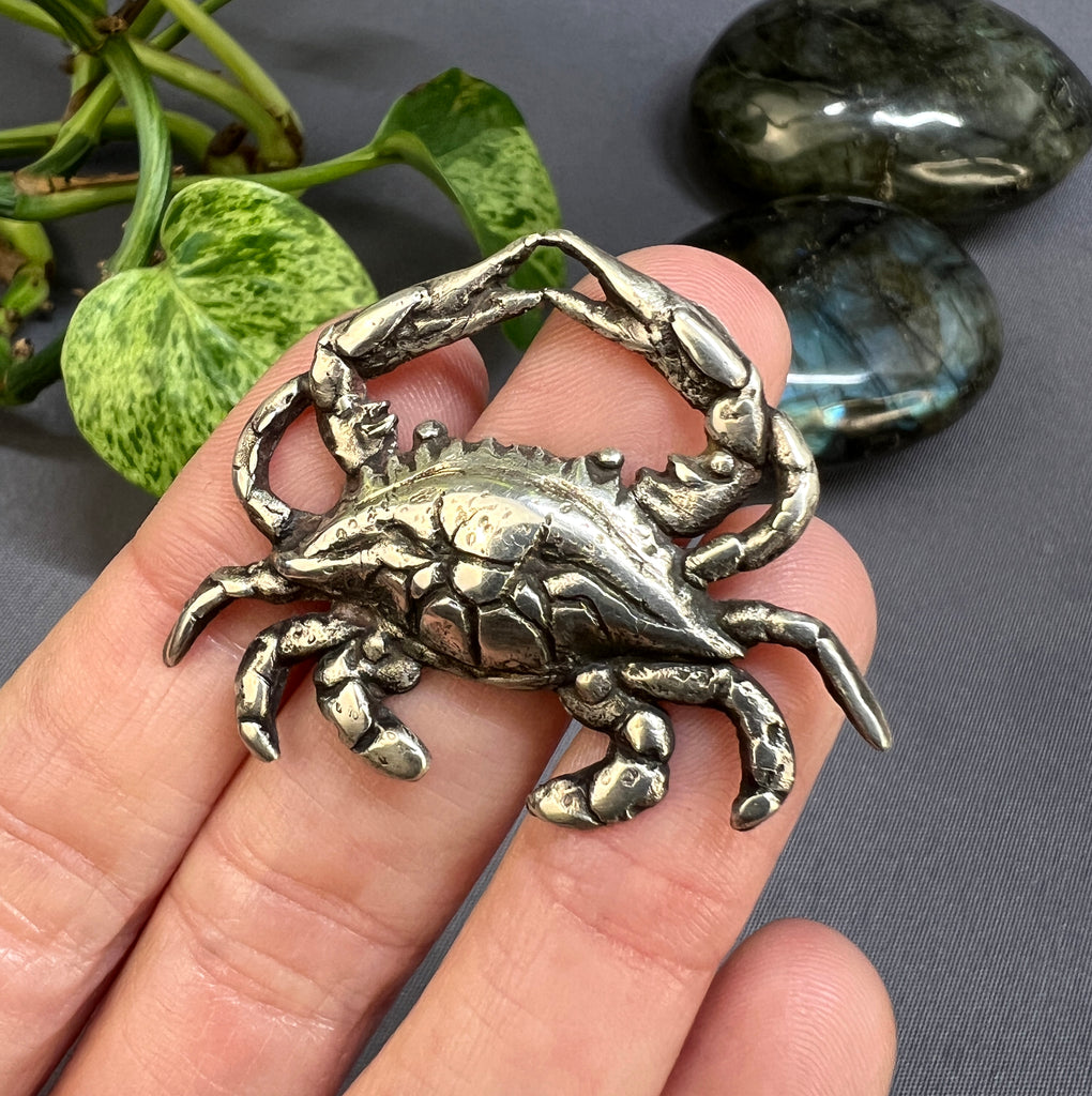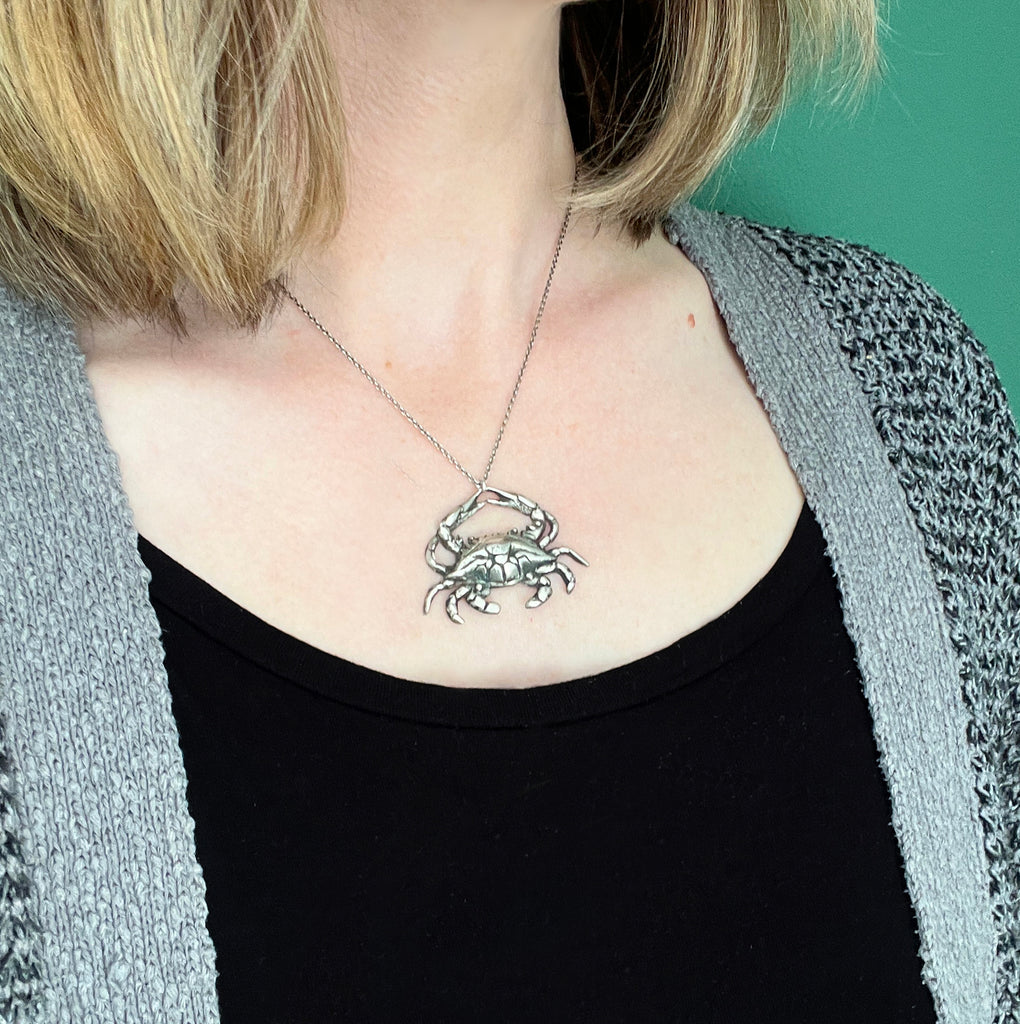 This beautiful crab pendant was carefully hand-sculpted with precious metal clay, torch-fired, oxidized and polished to a mirror finish. The piece is 99.9% fine silver.