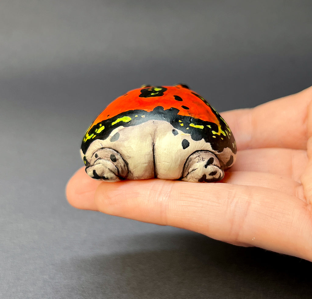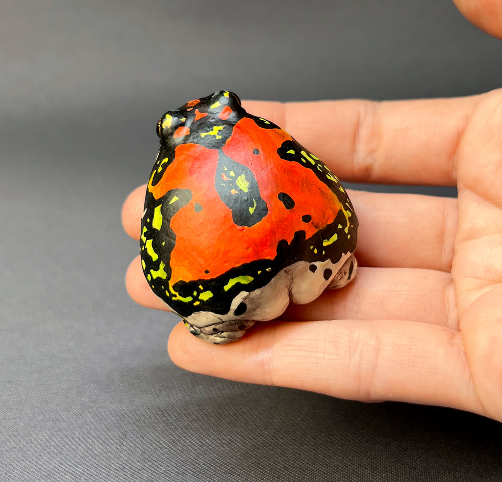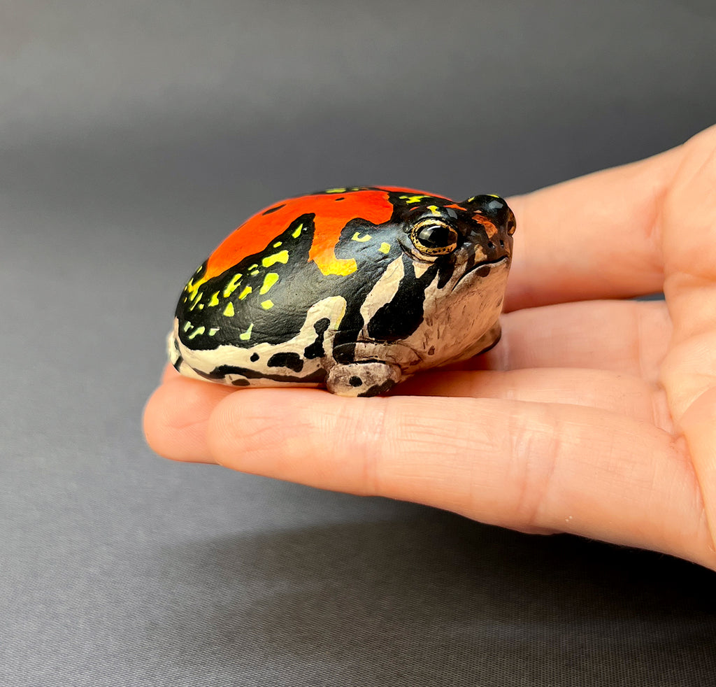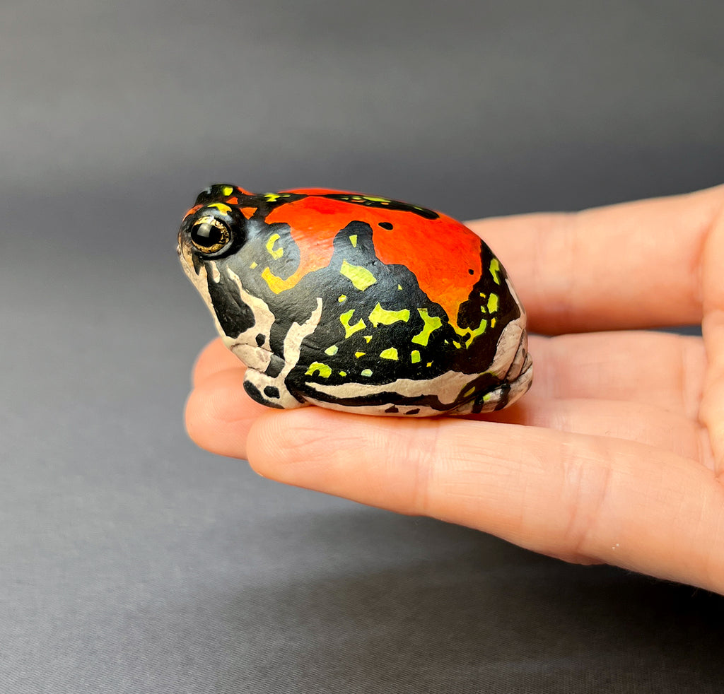 This frog was inspired by the The Malagasy rainbow frog species (Scaphiophryne gottlebei). It’s cast in hard white gypsum and carefully hand-painted. It measures about 1.75” (4.5cm) in diameter.